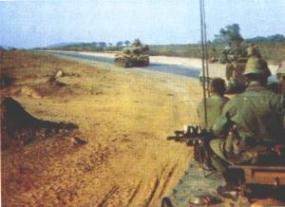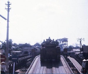 - Approaching the bridge over the Song Dinh on APC (water tower visible in distance)