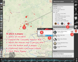 - Place a Poppy. As with the previous Battle Map update, the names of battle casualties are listed against many incidents (see an example here). You can now place a poppy (and optionally, a personal tribute) to somebody through this place. See Figure 3 for help on how to place a poppy.